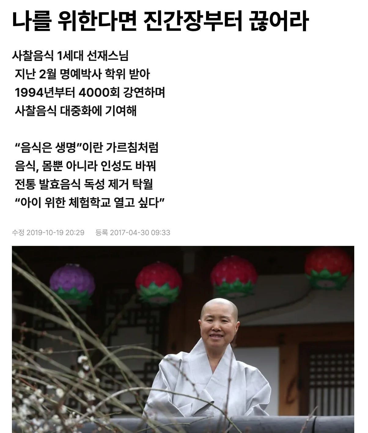 “제가 아플 때 저를 살린 게 김치와 장이었어요. 간경화를 앓을 때 토해서 다른 음식은 못 먹어도 장으로 한 음식은 먹을 수 있었어요. 인간도 생명이고 음식도 생명이어서 음식을 먹으면 독이 생길 수 있는데 발효 음식이 이 독을 막아줍니다. 그런데 진간장 같은 화학 간장은 그런 역할을 못 합니다. 그래서 진간장을 끊어야 합니다.”