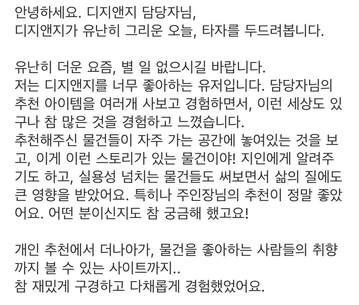 제겐 눈물이 살짝날 정도로 감동적인 메일이었습니다. 아직도 기다려주시는 분들이 계시구나. 다른 사람들에게 가치를 주고 있었구나. 마음 속 한 켠에 계속 똬리를 틀고 있던 dgng에 대해 다시 고민을 시작하게 된 계기이기도 했습니다. 언제 다시 시작하냐고 메일 주셨던 모든 분들께 진심으로 감사드립니다.